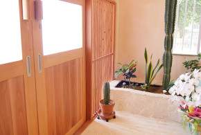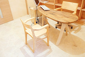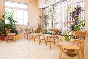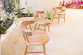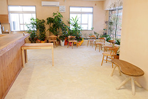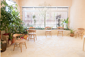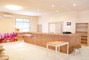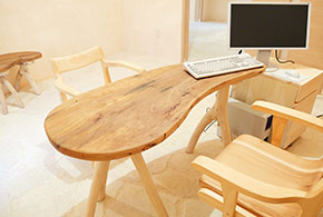 ゆったりと過ごしていただけるよう自然の素材にこだわりました。床には宮古島の石灰岩をしきつめ壁と天井は琉球漆喰と赤土を塗り込みました。床、壁、天井全てに宮古島生まれの麻炭をたっぷり使いました。やわらかな木の机と椅子がみなさまをお待ちしています。